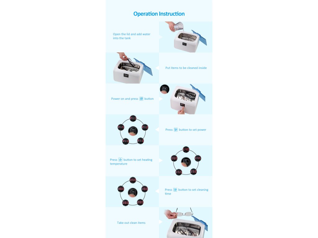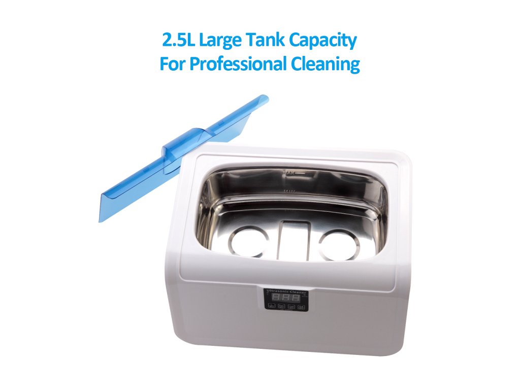 Digitální ultrazvuková čistička 7200A vyniká mezi malými ultrazvukovými čističkami svým vestavěným ohřívačem lázně, který je možné nastavit na teploty 40°, 45°, 50°, 55°, 60°C. Ultrazvuková čistička 7200A má i časovač pro délky čistících cyklů s pěti přednastavenými časy. Dále si sami můžete vybrat z pěti režimů jež se liší výkonem ultrazvuku. Vhodná pro čištění brýlí, šperků, mincí, hygienického nářadí, zubních protéz, kartuší do tiskáren nebo drobného nářadí.